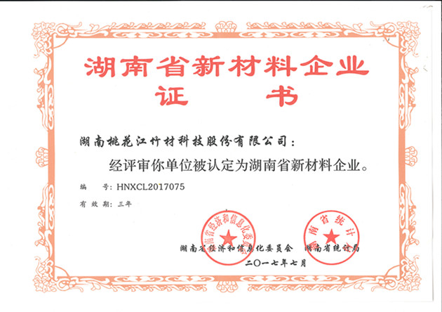 2017年7月,湖南省經濟和信息化委員會、湖南省統(tǒng)計局為湖南桃花江竹材科技股份有限公司正式頒發(fā)“湖南省新材料企業(yè)”證書(證書編號:HNXCL2017075)。湖南省新材料企業(yè)的認定,標志著湖南桃花江竹材科技在新型竹材領域的成績得到國家認可與支持,是一項具有含金量的突破性榮譽。作為中國竹業(yè)龍頭企業(yè),湖南桃花江竹材科技一直走在新型竹材研發(fā)、運用和推廣的前沿,為全球竹產業(yè)的發(fā)展持續(xù)貢獻力量。